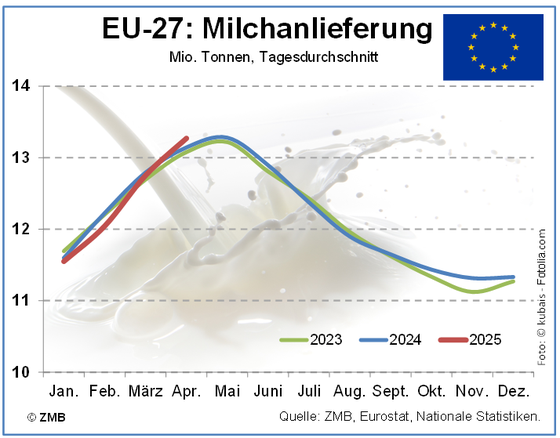 26.06.2025 – Die Milchanlieferung in der EU-27 war im April 2025 war erstmals seit Jahresbeginn höher als im Vorjahresmonat und insgesamt höher als erwartet. Nach einer Schätzung der ZMB wurden im April 1,0 % mehr Milch an die Molkereien geliefert als im Vorjahr um die gleiche Zeit. Besonders stark ausgeprägt war der Anstieg in Irland. Auch in Frankreich wurde die Vorjahreslinie im April erstmals im laufenden Jahr übertroffen. In Deutschland hat sich der Rückstand gegenüber dem Vorjahresniveau deutlich verringert. In den ersten vier Monaten von 2025 war die Milchanlieferung im Tagesdurchschnitt um 0,3 % niedriger als im Vorjahreszeitraum. (ZMB)