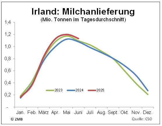 14.08.2025 – Die Milchanlieferung in Irland war im Juni 2025 weiter expansiv und hat sich über dem Niveau der beiden vorangegangenen Jahres bewegt. Die Wachstumsrate im Vergleich zum Vorjahr hat sich im Juni auf immer noch beachtliche 4,9 % verringert. Am höchsten war die Steigerung im April ausgeprägt gewesen. Im ersten Halbjahr von 2025 erfassten die Molkereien auf der grünen Insel 4,79 Mio. t Milch, womit die Vorjahresmenge kalenderbereinigt um 7,6 % und die im ersten Halbjahr von 2023 aufgenommene Menge um 1,9 % überschritten worden sind. Die Produktion von Konsummilch wurde im Zeitraum Januar bis Juni 2025 gegenüber dem Vergleichszeitraum leicht um 0,4 % reduziert. An Butter wurden 4,7 % mehr erzeugt. Für Januar und Februar 2025 liegen keine Daten zur Herstellung von Magermilchpulver vor. Von März bis Juni war die Produktion von Magermilchpulver um 44,5 % umfangreicher als im gleichen Zeitraum von 2024. (ZMB)