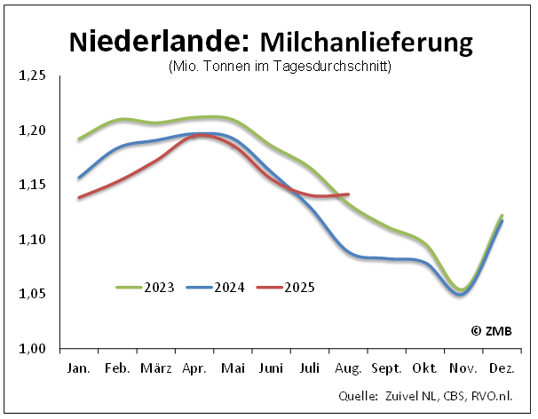 25.09.2025 – In den Niederlanden wich die Milchanlieferung im August 2025 deutlich vom üblichen saisonalen Verlauf in den Vorjahren ab. Die Milchmenge ist im Vergleich zum Vormonat Juli nicht saisonal gesunken, sondern sogar marginal gestiegen und hat damit gegenüber dem Vorjahresmonat um 4,8 % zugelegt. Damit wurde auch die Vergleichsmenge aus dem August 2023 um 0,8 % überschritten. Die Entwicklung dürfte maßgeblich auf verzögerte Abkalbungen als Spätfolge der Blauzungenkrankheit im Sommer 2024 zurückzuführen sein, die mit günstigen Wetter- und Futterbedingung sowie vergleichsweise hohen Margen in der Milchproduktion zusammengetroffen sind. Im Zeitraum Januar bis August 2025 war die Milchanlieferung mit 9,24 Mio. t um kalenderbereinigt 0,2 % niedriger als im Vorjahreszeitraum. Im Kalenderjahr 2025 dürfte das Milchaufkommen voraussichtlich das Vorjahresniveau übertreffen. (ZMB)