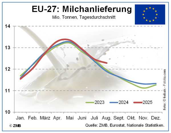 30.10.2025 – Der saisonale Rückgang der Milchanlieferung in der EU ist im laufenden Jahr seit August wesentlich schwächer ausgeprägt als für die Jahreszeit üblich. Im August 2025 wurden nach einer Hochrechnung der ZMB im Schnitt 3,3 % mehr Milch angeliefert als im Vorjahresmonat. In fast allen Mitgliedstaaten wurde das Vorjahresniveau zuletzt übertroffen, nachdem im ersten Halbjahr in einer Reihe von Ländern mit bedeutenden Milchmengen noch Rückgänge verzeichnet worden waren. Deutliches Wachstum wurde für den August unter anderem aus Deutschland (+2,1 %), den Niederlanden (+4,9 %), Frankreich (+4,0 %) und Polen (+4,9 %) gemeldet. Im Juli hatte sich das Wachstum noch auf 0,8 % belaufen. In den ersten acht Monaten von 2025 war das Milchaufkommen in der EU kalenderbereinigt um 0,5 % umfangreicher als im Vorjahreszeitraum. (ZMB)