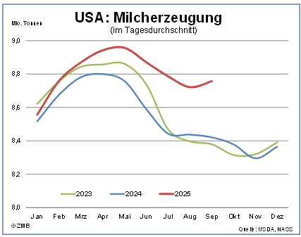 20.11.2025 – Die expansiven Tendenzen im Milchmarkt in den USA haben sich zuletzt verstärkt. Im September 2025 wurden 8,61 Mio. t Milch erzeugt und damit 4,0 % mehr als im Vorjahresmonat. In den ersten neun Monaten von 2025 stieg das Milchaufkommen auf 78,73 Mio. t und war kalenderbereinigt um 2,3 % höher als im Vorjahreszeit. Im dritten Quartal hat die Erzeugung mit einem Zuwachs von 3,8 % stärker an Fahrt aufgenommen. Die Milchviehherde wurde seit Jahresanfang zunehmend aufgestockt. Seit April ist sie größer als 2023 um die gleiche Zeit und zuletzt so groß wie seit 1993 nicht. Im September wurden 9,58 Mio. Milchkühe gezählt. Das waren beachtliche 2,4 % mehr als im Vorjahr um die gleiche Zeit. Die Milchleistung war im September um 1,5 % höher als vor einem Jahr.