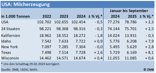 Die 24 für die Milchleistung wichtigsten Staaten hatten in den ersten neun Monaten einen kalenderbereinigten Zuwachs der Milcherzeugung von 2,5 % zu verzeichnen. Die Entwicklung in den fünf milchreichsten Staaten war uneinheitlich. Während für Kalifornien ein leichter Rückgang von 0,3 % gemeldet worden ist, legte die Milcherzeugung in Idaho (+7,9 %), New York (+2,8 %), Texas (+8,1 %) und Wisconsin (+0,6 %) zu. (ZMB)