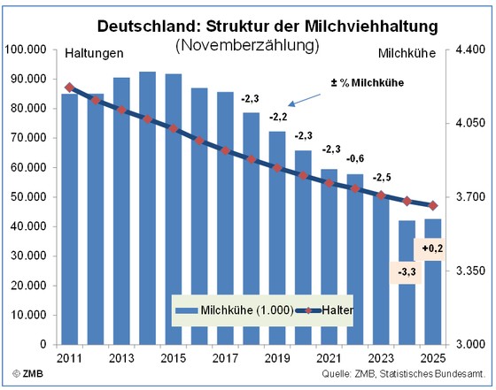 19.12.2025 – Der langjährige rückläufige Trend des Milchkuhbestandes in Deutschland ist 2025 unterbrochen worden. Im November 2025 wurden nach Angaben des Statistischen Bundesamtes (destatis) in Deutschland 3,597 Mio. Milchkühe gezählt. Das waren 0,2 % mehr als ein Jahr zuvor. Erstmals seit 2014 ist die Zahl der Milchkühe wieder leicht gestiegen. 2024 waren die Kuhzahlen aufgrund von massiven Ausbrüchen der Blauzungenkrankheit überdurchschnittlich stark um 3,3 % gesunken. Weiter zurückgegangen ist im laufenden Jahr die Zahl der Milchkuhhaltungen. Sie hat sich im Stichmonat auf 47.157 belaufen und war um 3,1 % niedriger als vor Jahresfrist. (ZMB).