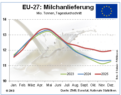 27.02.2026 – Die Milchanlieferung in der EU-27 ist 2025 nach einer Hochrechnung der ZMB auf voraussichtlich 148,5 Mio. t gestiegen. Das war die höchste Milchmenge in der Gemeinschaft seit dem Brexit. Im Vergleich zum Vorjahr ergibt sich kalenderbereinigt eine Steigerung um 1,9 %. Mengenmäßig betrachtet belief sich die Zunahme auf 2,4 Mio. t. Die Zunahme hat sich vor allem auf das zweite Halbjahr konzentriert. Im vierten Quartal war die Steigerung mit einem durchschnittlichen Plus von 5,4 % am stärksten ausgeprägt. Im Dezember wurden 5,6 % mehr Milch angeliefert als im Vorjahresmonat. (ZMB).