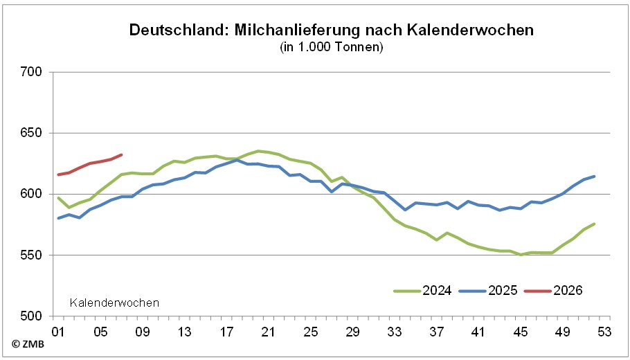 27.02.2026 – Die Milchanlieferung in der EU-27 ist 2025 nach einer Hochrechnung der ZMB auf voraussichtlich 148,5 Mio. t gestiegen. Das war die höchste Milchmenge in der Gemeinschaft seit dem Brexit. Im Vergleich zum Vorjahr ergibt sich kalenderbereinigt eine Steigerung um 1,9 %. Mengenmäßig betrachtet belief sich die Zunahme auf 2,4 Mio. t. Die Zunahme hat sich vor allem auf das zweite Halbjahr konzentriert. Im vierten Quartal war die Steigerung mit einem durchschnittlichen Plus von 5,4 % am stärksten ausgeprägt. Im Dezember wurden 5,6 % mehr Milch angeliefert als im Vorjahresmonat. (ZMB).