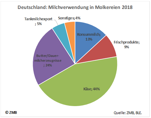 24.10.2019 – In Deutschland wurden 2018 44 Prozent des verfügbaren Rohstoffs in den Molkereien zu Käse verarbeitet. Damit ist Käse die wichtigste Verwertungsschiene für die Milch in Deutschland. Dies geht aus den Erhebungen der BLE im Rahmen der Melde-Verordnung Milch hervor. Mit 24 Prozent wurde knapp ein Viertel der erfassten Milch zur Herstellung von Butter und verschiedenen Dauermilcherzeugnissen eingesetzt. Weitere 13 Prozent hat die Produktion von Konsummilch gebunden und neun Prozent wurden zu Frischprodukten wie Joghurt und Sahne veredelt. Fünf Prozent wurden als Tankmilch exportiert und vier Prozent wanderten in sonstige Verwertungen. (ZMB)Niederlande: Milchanlieferung wieder über Vorjahresniveau
