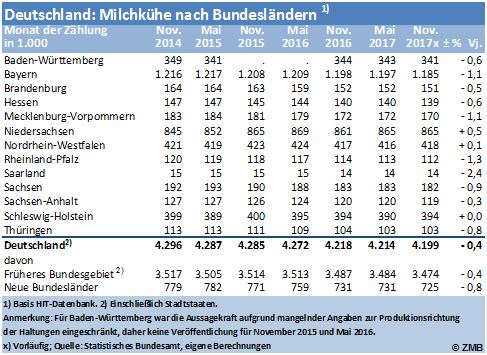 In allen Bundesländern ist die Anzahl der Milchkühe gesunken, wobei die Abnahmeraten aber regional unterschiedlich waren. In Niedersachsen war der Rückgang mit einem Minus von 0,6 % am schwächsten ausgeprägt, in Thüringen mit 5,6 % am stärksten. In den neuen Bundesländern wurde der Milchkuhbestand im Schnitt um 3,8 % verringert und damit spürbar stärker als in den alten Bundesländern mit einer durchschnittlichen Abnahme um 0,8 %. Der Milchkuhbestand im Mai 2017 war der niedrigste seit fünf Jahren. Der Höchststand im letzten Jahrzehnt war im Mai 2014 mit 4,311 Mio. Tieren registriert worden.