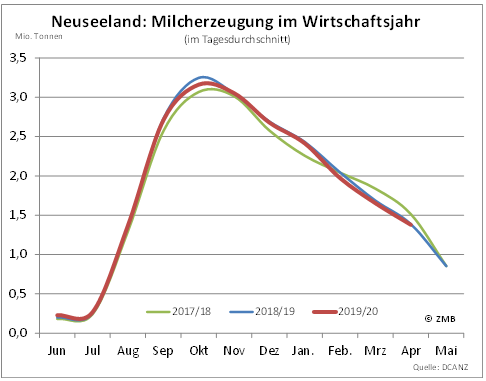 28.05.2020 – In Neuseeland ist die Milcherzeugung im April 2020 weiter saisonal zurückgegangen und hatten einen Umfang von 1,36 % Mio. t. Das Vorjahresniveau wurde damit um 0,6 % unterschritten. Damit hat im Vergleich zum März mit einem Rückstand um 1,9 % eine Stabilisierung stattgefunden. Die Milchmenge belief sich in den ersten vier Monaten von 2020 auf 7,37 Mio. t, womit die entsprechende Vorjahresmenge im Tagesdurchschnitt um 1,6 % unterschritten worden ist. Die ersten elf Monate des neuseeländischen Milchwirtschaftsjahres gingen mit einer erzeugten Menge von 20,86 Mio. t Milch zu Ende. Das waren im Tagesdurchschnitt 0,8 % weniger als im Vorjahreszeitraum.Die größte neuseeländische Molkereigenossenschaft Fonterra hat ihre Milchpreisprognose für das ablaufende Wirtschaftsjahr 2019/20 auf 7,10 bis 7,30 NZD/kg Milchinhaltsstoffe eingeengt. Zuvor hatte die Erwartung noch zwischen 7,00 und 7,60 NZD/kg gelegen. Hinzu soll eine Dividende in Höhe von 15 bis 25 NZD/kg je Geschäftsanteil kommen. Dies entspräche umgerechnet für ein Kilogramm Milch mit europäischen Inhaltsstoffen und bei aktuellen Wechselkursen etwa 31 Eurocent. Für das kommende Jahr 2020/21 sind die Aussichten für die Milchpreisentwicklung unsicher. Dies zeigt die angekündigte erwartete Preisspanne von 5,40 bis 6,90 NZD/kg Milchinhaltsstoffe was umgerechnet 23 bis 29 Eurocent bedeutet. In einer Pressemitteilung verweist das Unternehmen darauf, dass die Corona-Pandemie alle Länder der Welt betrifft und die Unsicherheit für ein Unternehmen mit einem Exportanteil von 95 % entsprechend sehr groß sei. Die Preise für Vollmilchpulver seien seit Januar 2020 um 17 % gesunken. (ZMB)